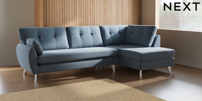 7.3.1 Buy Wilson Buttoned Back Large Corner Chaise - Right Hand Relaxed Linen Look Mid Blue Metal Tapered - Chrome from the Next UK online shop Click here to use our accessible website