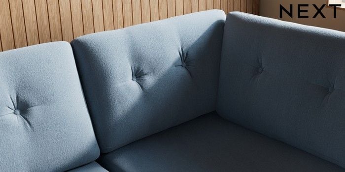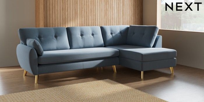 7.3.1 Buy Wilson Buttoned Back Large Corner Chaise - Right Hand Relaxed Linen Look Mid Blue Metal Tapered - Gold from the Next UK online shop Click here to use our accessible website