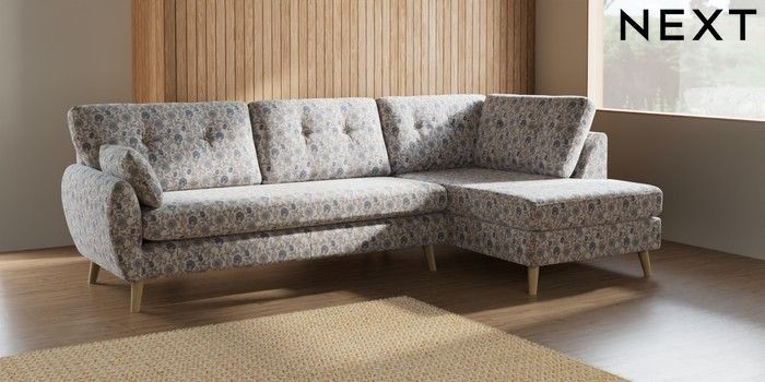 7.2.10 Buy Wilson Buttoned Back Large Corner Chaise - Right Hand Relaxed Linen Look Print Woodblock Floral Blue Retro Tapered - Light from the Next UK online shop Click here to use our accessible website