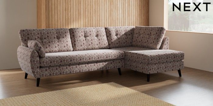 7.2.10 Buy Wilson Buttoned Back Large Corner Chaise - Right Hand Relaxed Linen Look Print Woodblock Floral Print Pink Retro Tapered - Dark from the Next UK online shop Click here to use our accessible website