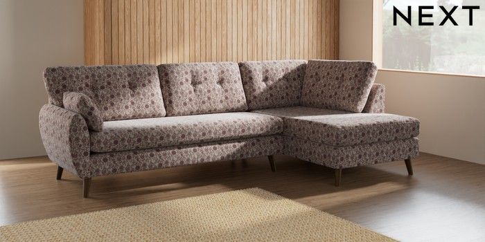 7.2.10 Buy Wilson Buttoned Back Large Corner Chaise - Right Hand Relaxed Linen Look Print Woodblock Floral Print Pink Retro Tapered - Mid from the Next UK online shop Click here to use our accessible website