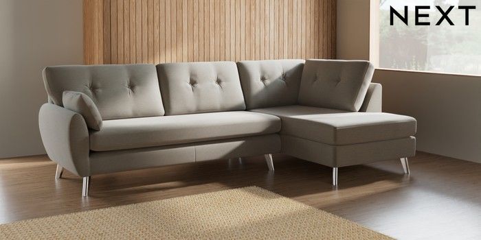 7.2.10 Buy Wilson Buttoned Back Large Corner Chaise - Right Hand Ripple Chenille Light Natural Metal Tapered - Chrome from the Next UK online shop Click here to use our accessible website