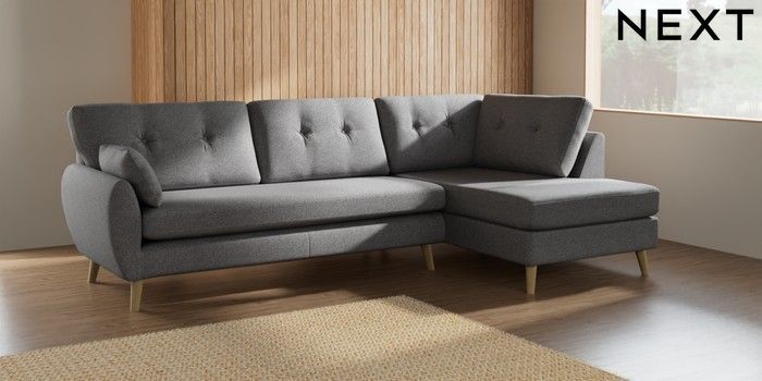 7.2.10 Buy Wilson Buttoned Back Large Corner Chaise - Right Hand Studio Chenille Mid Grey Retro Tapered - Light from the Next UK online shop Click here to use our accessible website