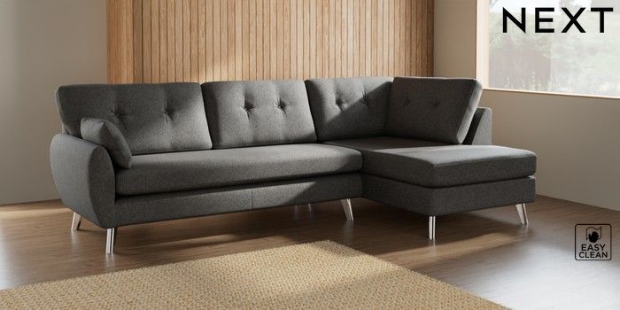 7.3.1 Buy Wilson Buttoned Back Large Corner Chaise - Right Hand Tweedy Blend Easy Clean Dark Grey Metal Tapered - Chrome from the Next UK online shop Click here to use our accessible website