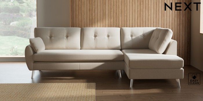 7.3.1 Buy Wilson Buttoned Back Large Corner Chaise - Right Hand Tweedy Blend Easy Clean Oyster Metal Tapered - Chrome from the Next UK online shop Click here to use our accessible website