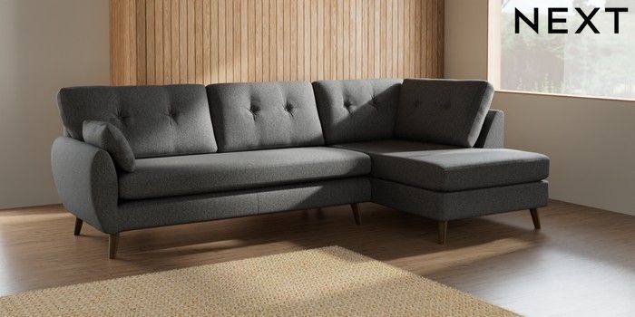 7.2.10 Buy Wilson Buttoned Back Large Corner Chaise - Right Hand Tweedy Chenille Dark Grey Retro Tapered - Mid from the Next UK online shop Click here to use our accessible website