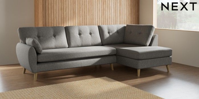 7.2.10 Buy Wilson Buttoned Back Large Corner Chaise - Right Hand Tweedy Chenille Mid Grey Retro Tapered - Light from the Next UK online shop Click here to use our accessible website