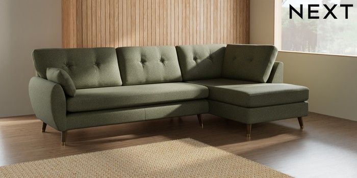 7.3.1 Buy Wilson Buttoned Back Large Corner Chaise - Right Hand Tweedy Chenille Mid Moss Green Low Retro Tapered Metal Cap - Mid from the Next UK online shop Click here to use our accessible website
