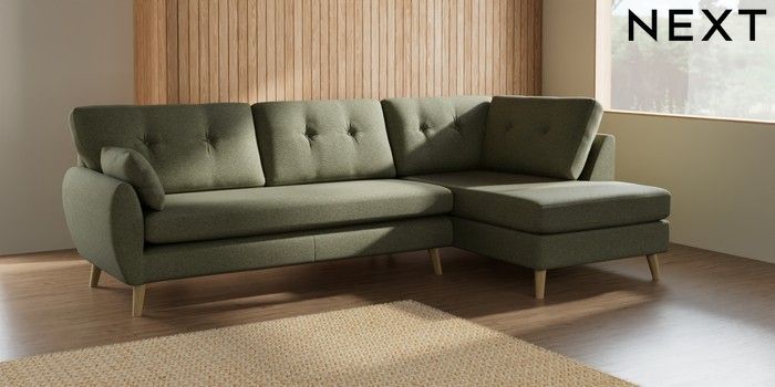 7.3.1 Buy Wilson Buttoned Back Large Corner Chaise - Right Hand Tweedy Chenille Mid Moss Green Retro Tapered - Light from the Next UK online shop Click here to use our accessible website