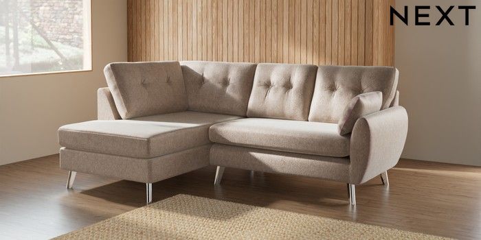 7.2.10 Buy Wilson Buttoned Back Medium Corner Chaise - Left Hand Cotswold Chenille Light Natural Metal Tapered - Chrome from the Next UK online shop Click here to use our accessible website