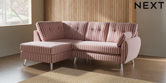 7.2.10 Buy Wilson Buttoned Back Medium Corner Chaise - Left Hand Bold Chenille Stripe Dark Pink Metal Tapered - Chrome from the Next UK online shop Click here to use our accessible website