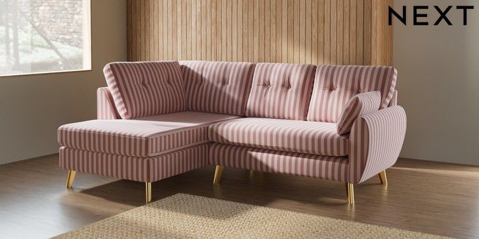 7.2.10 Buy Wilson Buttoned Back Medium Corner Chaise - Left Hand Bold Chenille Stripe Dark Pink Metal Tapered - Gold from the Next UK online shop Click here to use our accessible website