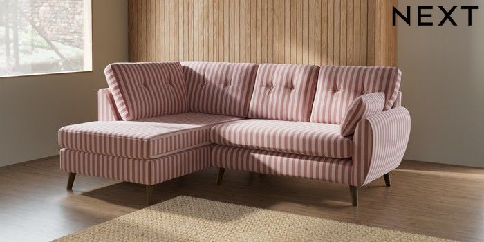 7.2.10 Buy Wilson Buttoned Back Medium Corner Chaise - Left Hand Bold Chenille Stripe Dark Pink Retro Tapered - Mid from the Next UK online shop Click here to use our accessible website