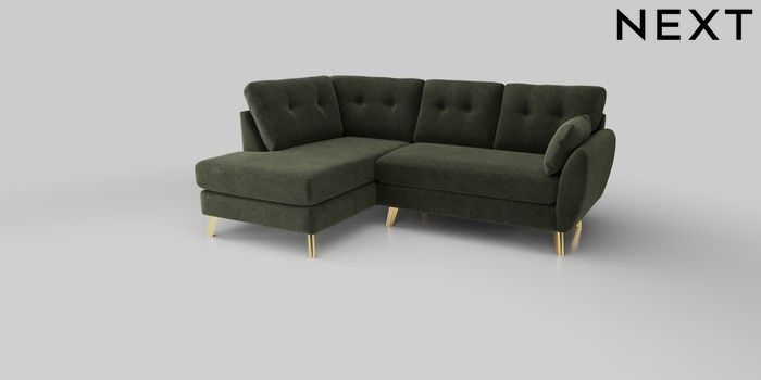 6.12.1 Buy Wilson Buttoned Back Medium Corner Chaise - Left Hand Boucle Chenille Dark Moss Green Metal Tapered - Gold from the Next UK online shop Click here to use our accessible website