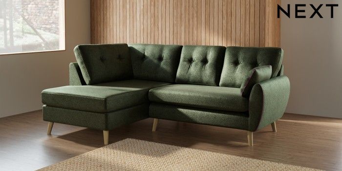 7.2.10 Buy Wilson Buttoned Back Medium Corner Chaise - Left Hand Boucle Chenille Dark Moss Green Retro Tapered - Light from the Next UK online shop Click here to use our accessible website