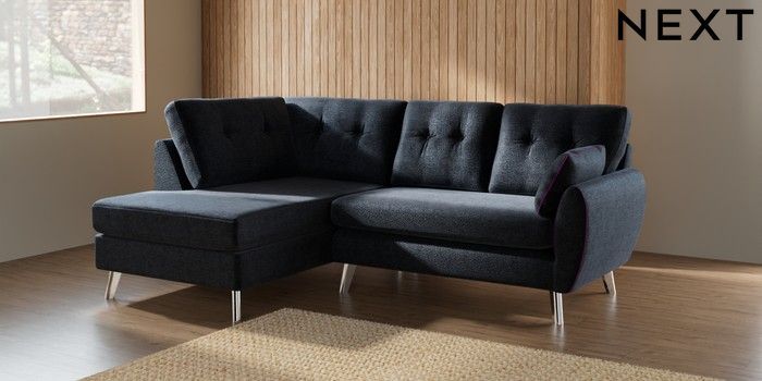 7.2.10 Buy Wilson Buttoned Back Medium Corner Chaise - Left Hand Boucle Chenille Dark Slate Blue Metal Tapered - Chrome from the Next UK online shop Click here to use our accessible website