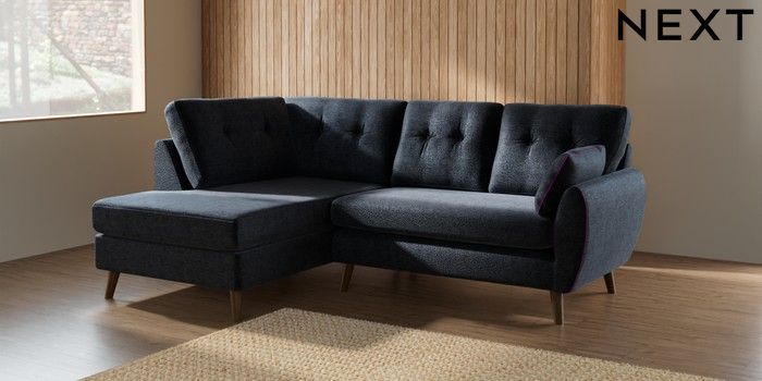7.2.10 Buy Wilson Buttoned Back Medium Corner Chaise - Left Hand Boucle Chenille Dark Slate Blue Retro Tapered - Mid from the Next UK online shop Click here to use our accessible website