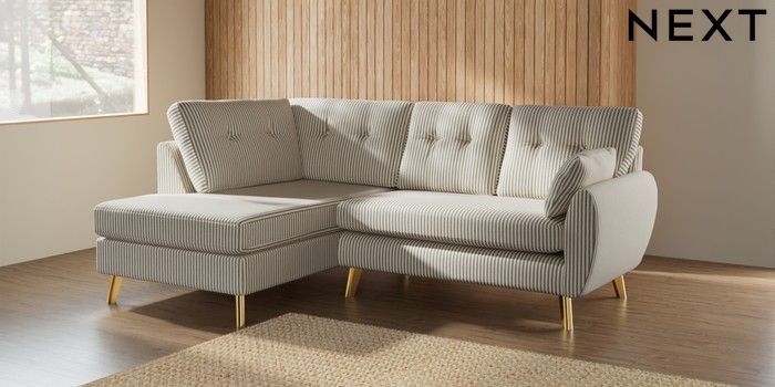 7.2.10 Buy Wilson Buttoned Back Medium Corner Chaise - Left Hand Chenille Stripe Moss Green Metal Tapered - Gold from the Next UK online shop Click here to use our accessible website
