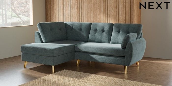 7.2.10 Buy Wilson Buttoned Back Medium Corner Chaise - Left Hand Chunky Chenille Light Teal Green Metal Tapered - Gold from the Next UK online shop Click here to use our accessible website