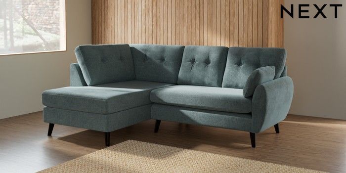 7.2.10 Buy Wilson Buttoned Back Medium Corner Chaise - Left Hand Chunky Chenille Light Teal Green Retro Tapered - Dark from the Next UK online shop Click here to use our accessible website