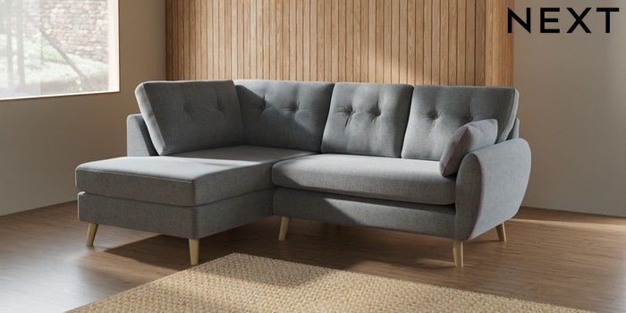 7.2.10 Buy Wilson Buttoned Back Medium Corner Chaise - Left Hand Chunky Marl Mid Grey Retro Tapered - Light from the Next UK online shop Click here to use our accessible website