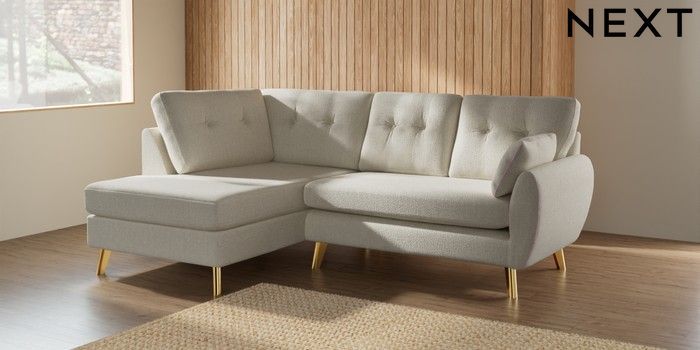 7.2.10 Buy Wilson Buttoned Back Medium Corner Chaise - Left Hand Chunky Texture Oyster Metal Tapered - Gold from the Next UK online shop Click here to use our accessible website