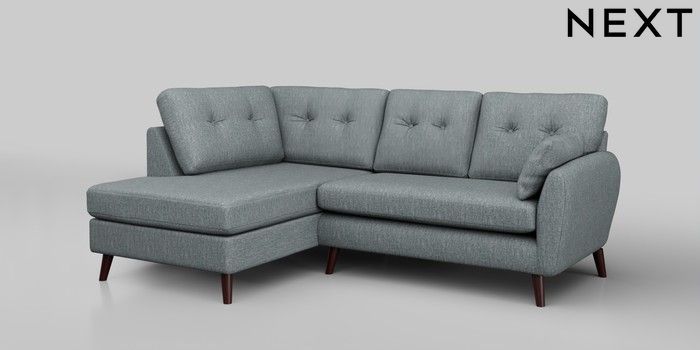 6.12.1 Buy Wilson Buttoned Back Medium Corner Chaise - Left Hand Chunky Weave Mid Blue Retro Tapered - Dark Brown from the Next UK online shop Click here to use our accessible website