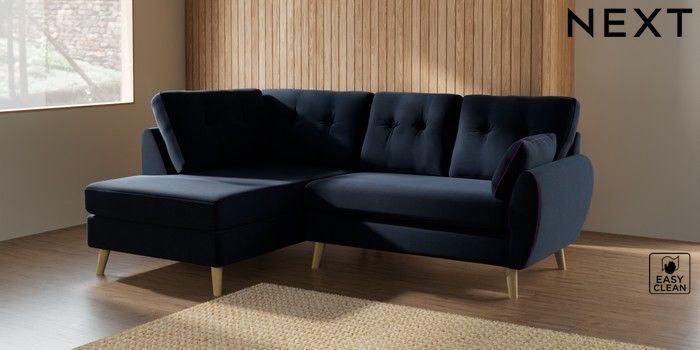 7.2.10 Buy Wilson Buttoned Back Medium Corner Chaise - Left Hand Fine Chenille Easy Clean Dark Navy Blue Retro Tapered - Light from the Next UK online shop Click here to use our accessible website