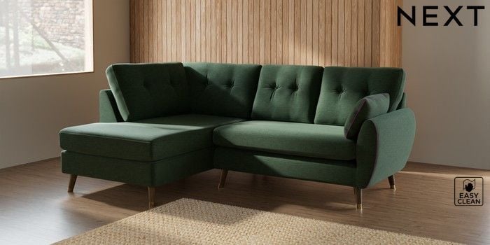 7.3.1 Buy Wilson Buttoned Back Medium Corner Chaise - Left Hand Fine Chenille Easy Clean Mid Khaki Green Low Retro Tapered Metal Cap - Mid from the Next UK online shop Click here to use our accessible website
