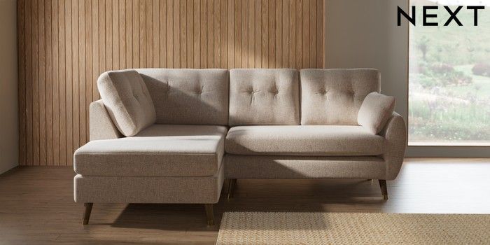 7.3.1 Buy Wilson Buttoned Back Medium Corner Chaise - Left Hand Multi Weave Mid Natural Low Retro Tapered Metal Cap - Mid from the Next UK online shop