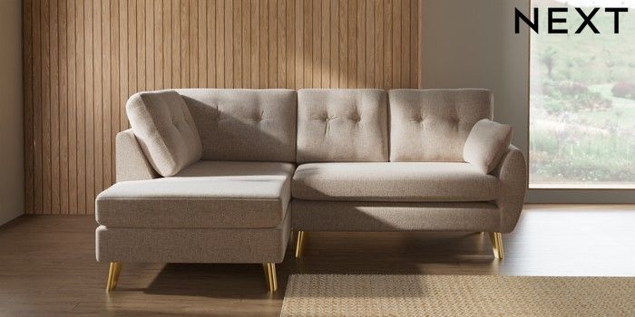 7.3.1 Buy Wilson Buttoned Back Medium Corner Chaise - Left Hand Multi Weave Mid Natural Metal Tapered - Gold from the Next UK online shop