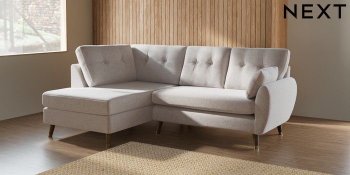 7.2.6 Buy Wilson Buttoned Back Medium Corner Chaise - Left Hand Multi Weave Oyster Low Retro Tapered Metal Cap - Mid from the Next UK online shop Click here to use our accessible website