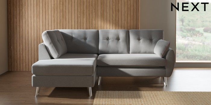 7.3.1 Buy Wilson Buttoned Back Medium Corner Chaise - Left Hand Natural Mix Light Grey Metal Tapered - Chrome from the Next UK online shop