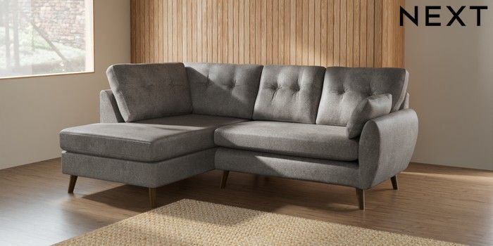 7.2.10 Buy Wilson Buttoned Back Medium Corner Chaise - Left Hand Plush Chenille Light Grey Retro Tapered - Mid from the Next UK online shop Click here to use our accessible website