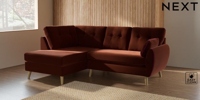 7.2.10 Buy Wilson Buttoned Back Medium Corner Chaise - Left Hand Plush Velvet Easy Clean Ginger Orange Retro Tapered - Light from the Next UK online shop Click here to use our accessible website