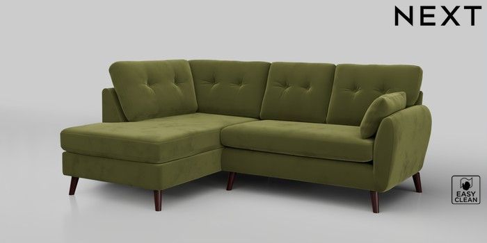 6.12.1 Buy Wilson Buttoned Back Medium Corner Chaise - Left Hand Plush Velvet Easy Clean Mid Olive Green Retro Tapered - Dark Brown from the Next UK online shop Click here to use our accessible website