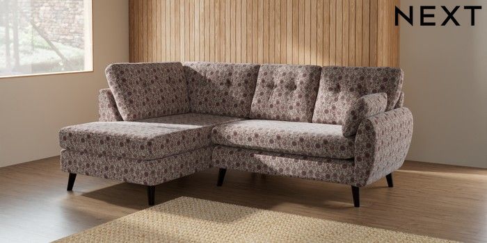 7.2.10 Buy Wilson Buttoned Back Medium Corner Chaise - Left Hand Relaxed Linen Look Print Woodblock Floral Print Pink Retro Tapered - Dark from the Next UK online shop Click here to use our accessible website