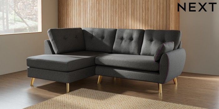 7.3.1 Buy Wilson Buttoned Back Medium Corner Chaise - Left Hand Tweedy Chenille Dark Grey Metal Tapered - Gold from the Next UK online shop Click here to use our accessible website