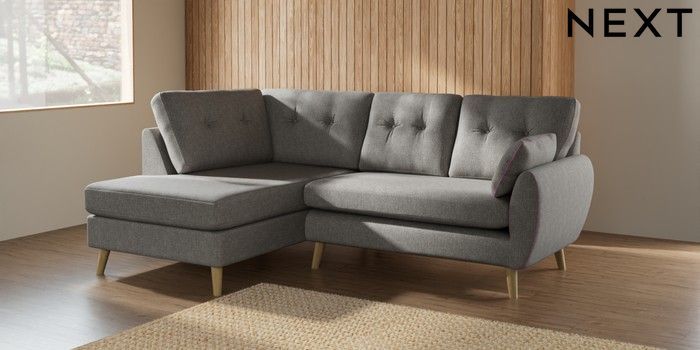 7.2.10 Buy Wilson Buttoned Back Medium Corner Chaise - Left Hand Tweedy Chenille Mid Grey Retro Tapered - Light from the Next UK online shop Click here to use our accessible website