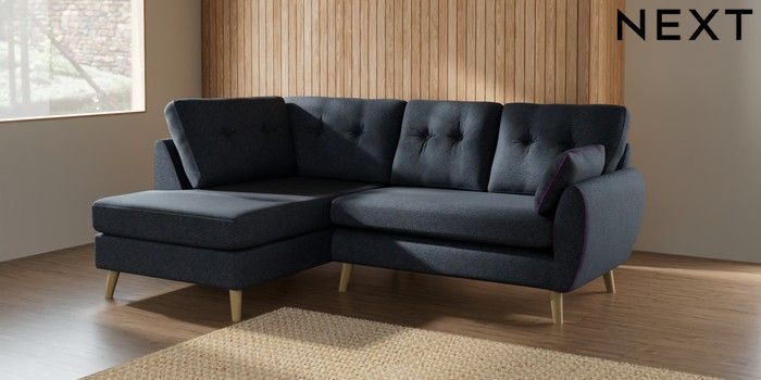 7.2.10 Buy Wilson Buttoned Back Medium Corner Chaise - Left Hand Tweedy Chenille Navy Blue Retro Tapered - Light from the Next UK online shop Click here to use our accessible website