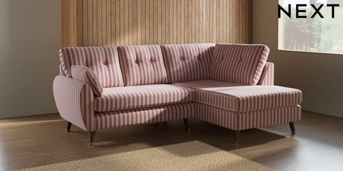 7.2.10 Buy Wilson Buttoned Back Medium Corner Chaise - Right Hand Bold Chenille Stripe Dark Pink Low Retro Tapered Metal Cap - Mid from the Next UK online shop Click here to use our accessible website