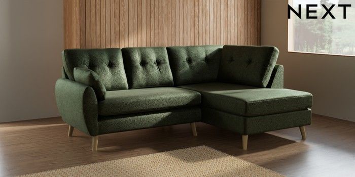 7.2.10 Buy Wilson Buttoned Back Medium Corner Chaise - Right Hand Boucle Chenille Dark Moss Green Retro Tapered - Light from the Next UK online shop Click here to use our accessible website