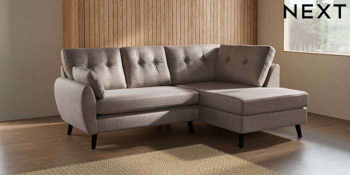 7.2.10 Buy Wilson Buttoned Back Medium Corner Chaise - Right Hand Boucle Chenille Light Natural Retro Tapered - Dark from the Next UK online shop Click here to use our accessible website