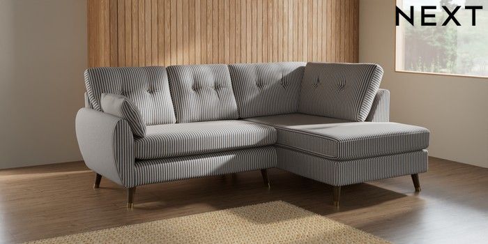 7.2.10 Buy Wilson Buttoned Back Medium Corner Chaise - Right Hand Chenille Stripe Slate Blue Low Retro Tapered Metal Cap - Mid from the Next UK online shop Click here to use our accessible website