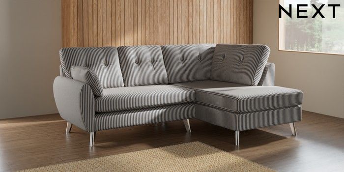 7.2.10 Buy Wilson Buttoned Back Medium Corner Chaise - Right Hand Chenille Stripe Slate Blue Metal Tapered - Chrome from the Next UK online shop Click here to use our accessible website