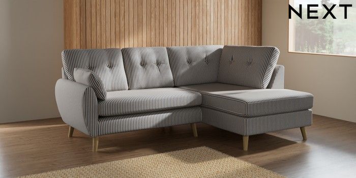 7.2.10 Buy Wilson Buttoned Back Medium Corner Chaise - Right Hand Chenille Stripe Slate Blue Retro Tapered - Light from the Next UK online shop Click here to use our accessible website