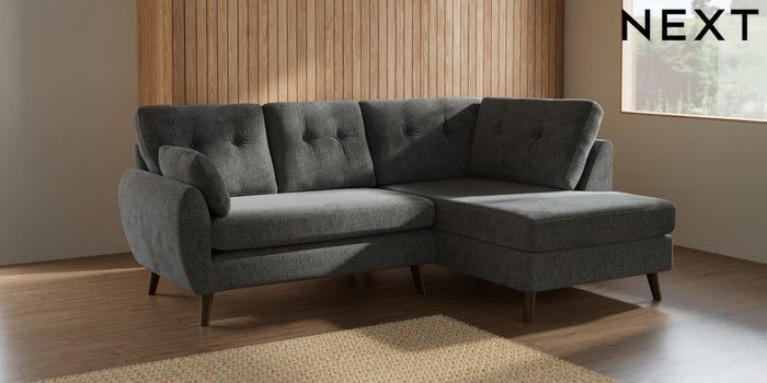 7.2.10 Buy Wilson Buttoned Back Medium Corner Chaise - Right Hand Chunky Chenille Dark Grey Retro Tapered - Mid from the Next UK online shop Click here to use our accessible website
