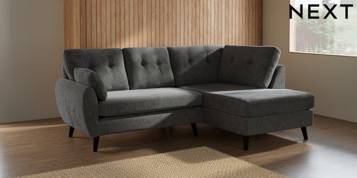 7.2.10 Buy Wilson Buttoned Back Medium Corner Chaise - Right Hand Chunky Chenille Dark Grey Retro Tapered - Dark from the Next UK online shop Click here to use our accessible website
