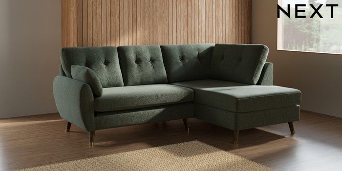 7.2.10 Buy Wilson Buttoned Back Medium Corner Chaise - Right Hand Chunky Texture Mid Forest Green Low Retro Tapered Metal Cap - Mid from the Next UK online shop Click here to use our accessible website