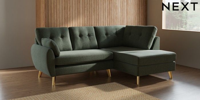 7.2.10 Buy Wilson Buttoned Back Medium Corner Chaise - Right Hand Chunky Texture Mid Forest Green Metal Tapered - Gold from the Next UK online shop Click here to use our accessible website
